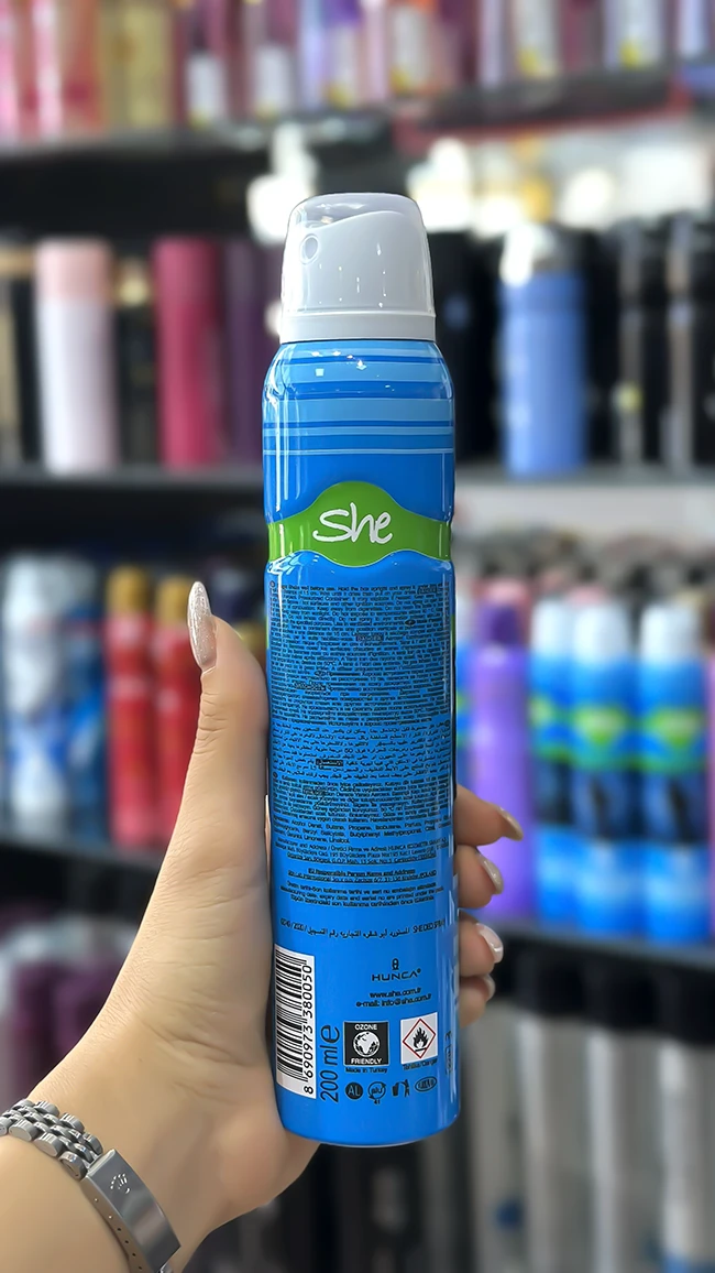 برند She یک برند محبوب در زمینه اسپری بدن، بادی‌میست، عطر و محصولات خوشبوکننده است که با تمرکز بر رایحه‌های متنوع، جوان‌پسند و ماندگار، جایگاه ویژه‌ای در بازار محصولات مراقبت شخصی پیدا کرده است.محصولات برند She معمولاً با طراحی شاد، رنگ‌های زنده و نام‌های خاص برای هر رایحه (مثل She Is Pretty، She Is Cool، She Is Sexy و...) شناخته می‌شوند. این برند با هدف ارائه محصولاتی اقتصادی و در عین حال با کیفیت قابل قبول، به‌ویژه در بین نوجوانان و جوانان طرفداران زیادی دارد.عطرها و اسپری‌های She ساخت کشور ترکیه هستند و تحت لیسانس شرکت بزرگ Hunca Cosmetics تولید می‌شوند. رایحه‌های جذاب، بسته‌بندی‌های دخترانه و قیمت مناسب باعث شده محصولات این برند در کشورهای مختلف، از جمله ایران، بسیار پرطرفدار باشند.اگر به‌دنبال یک اسپری بدن یا بادی‌میست خوشبو، سبک و مقرون‌به‌صرفه برای استفاده روزمره هستید، She یکی از انتخاب‌های جذاب و کاربردی برای شماست.