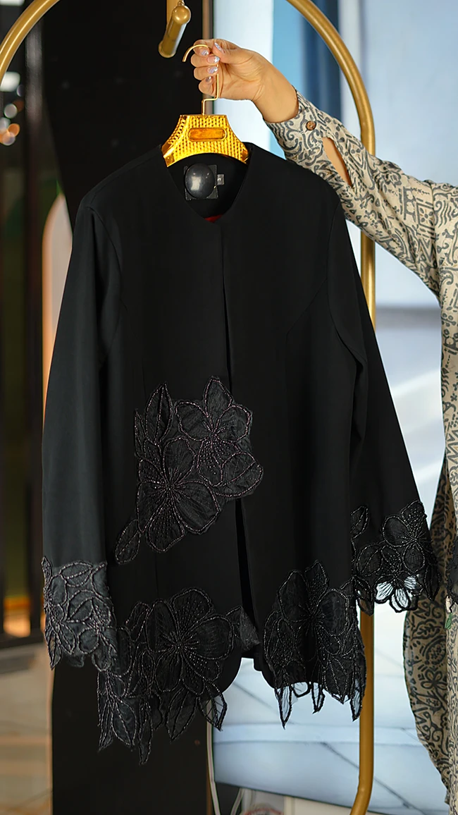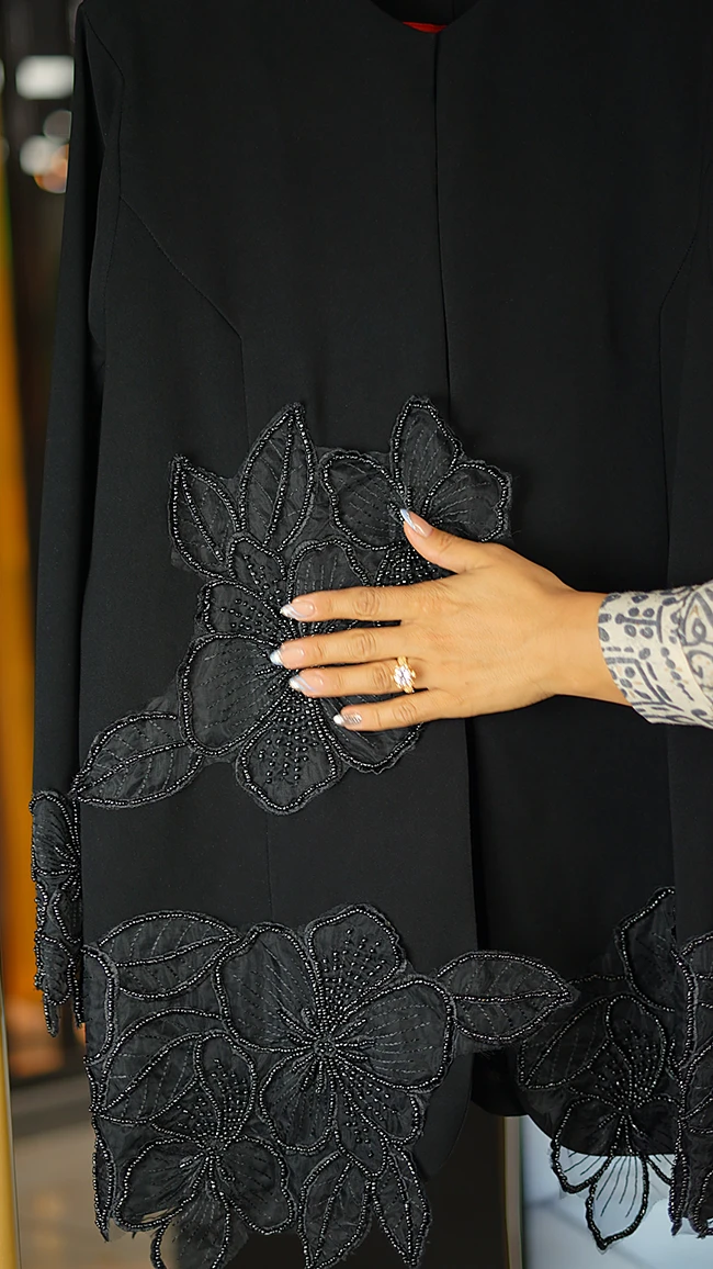 مانتو مجلسی کارشده مدل Berbina مشکی – طراحی خاص با سنگدوزی و ریشهدوزی