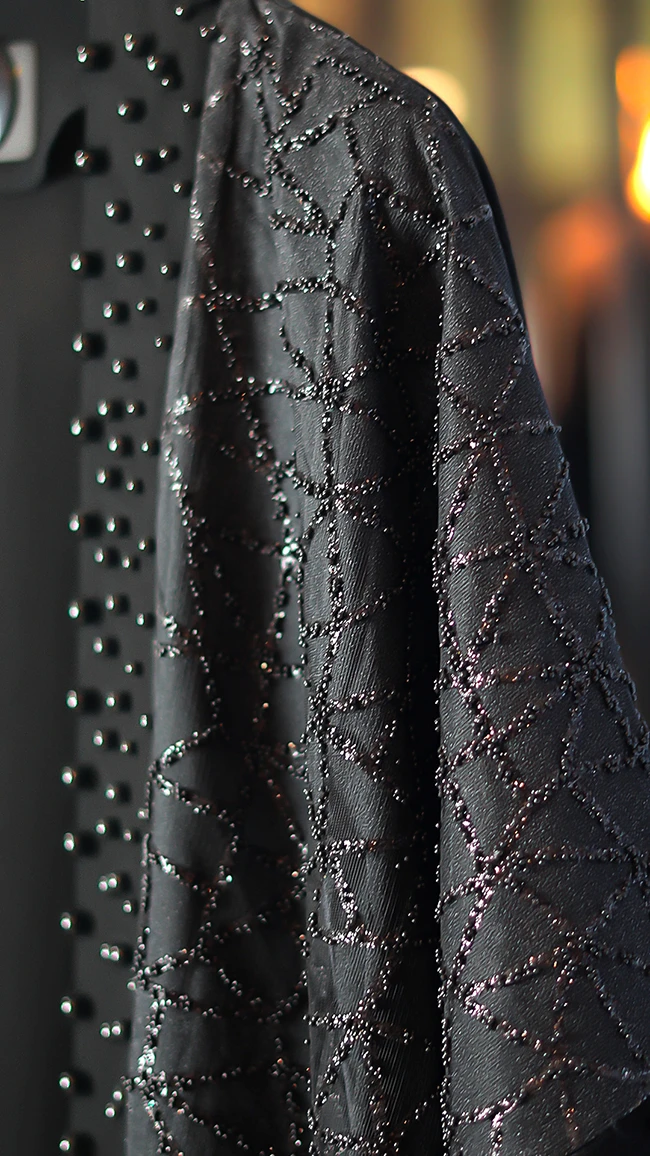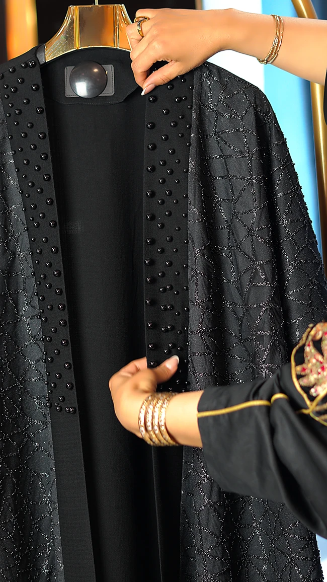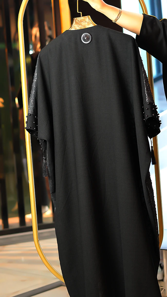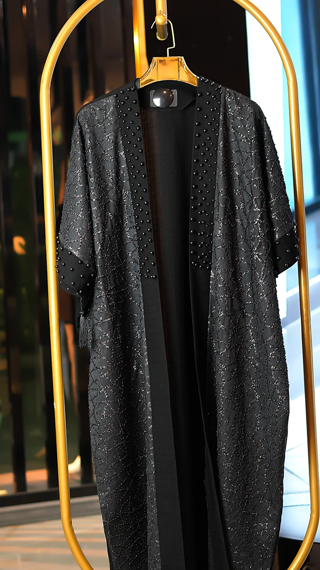 مانتو مجلسی کارشده مدل Berbina مشکی – طراحی خاص با سنگدوزی و ریشهدوزی
