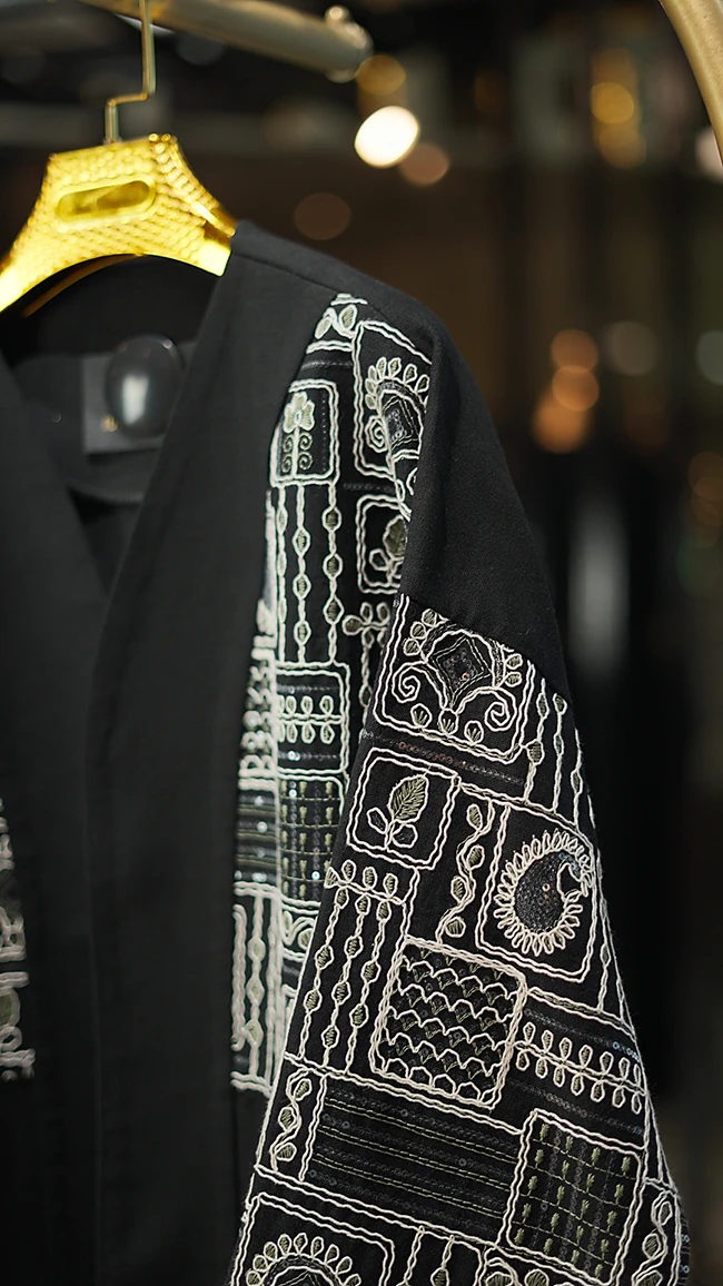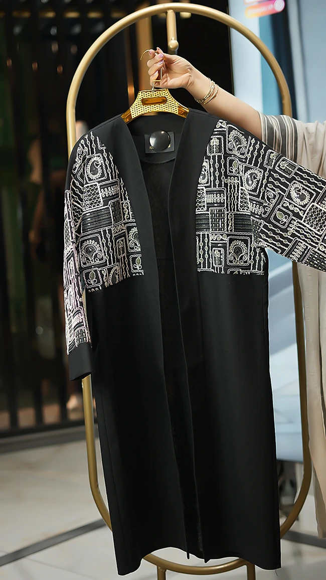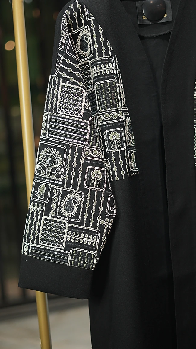 مانتو مجلسی کارشده مدل Berbina مشکی – طراحی خاص با سنگدوزی و ریشهدوزی