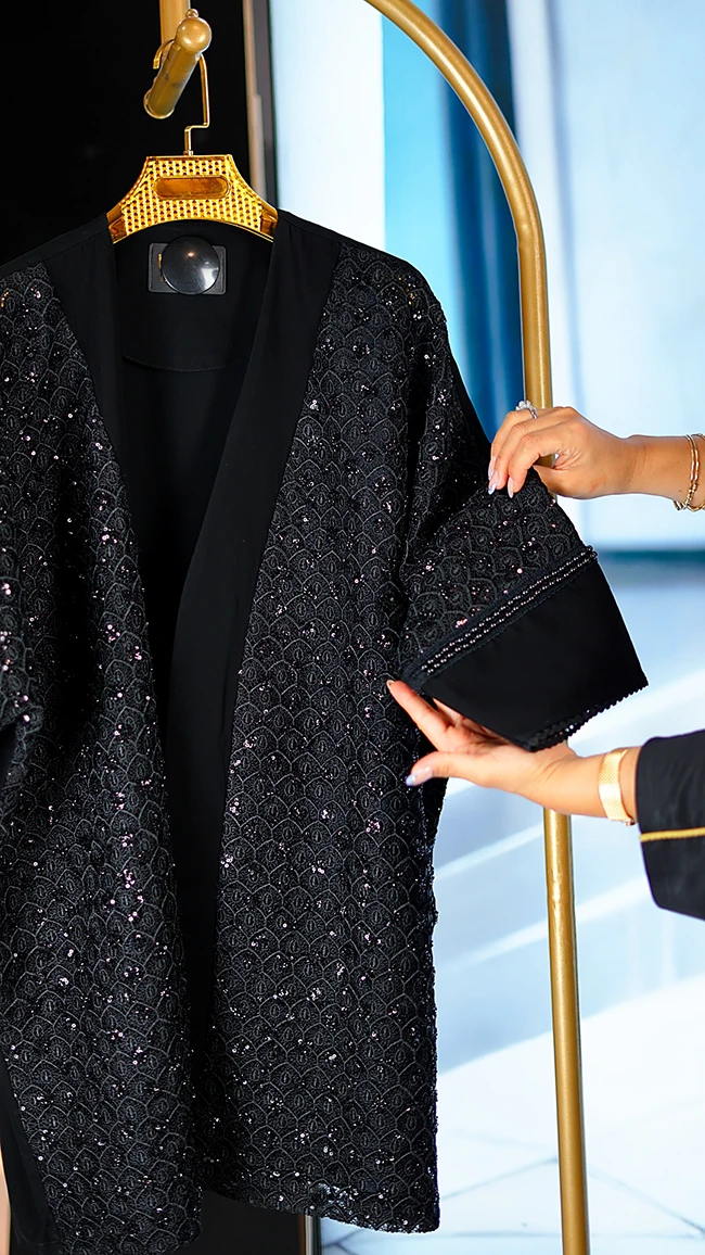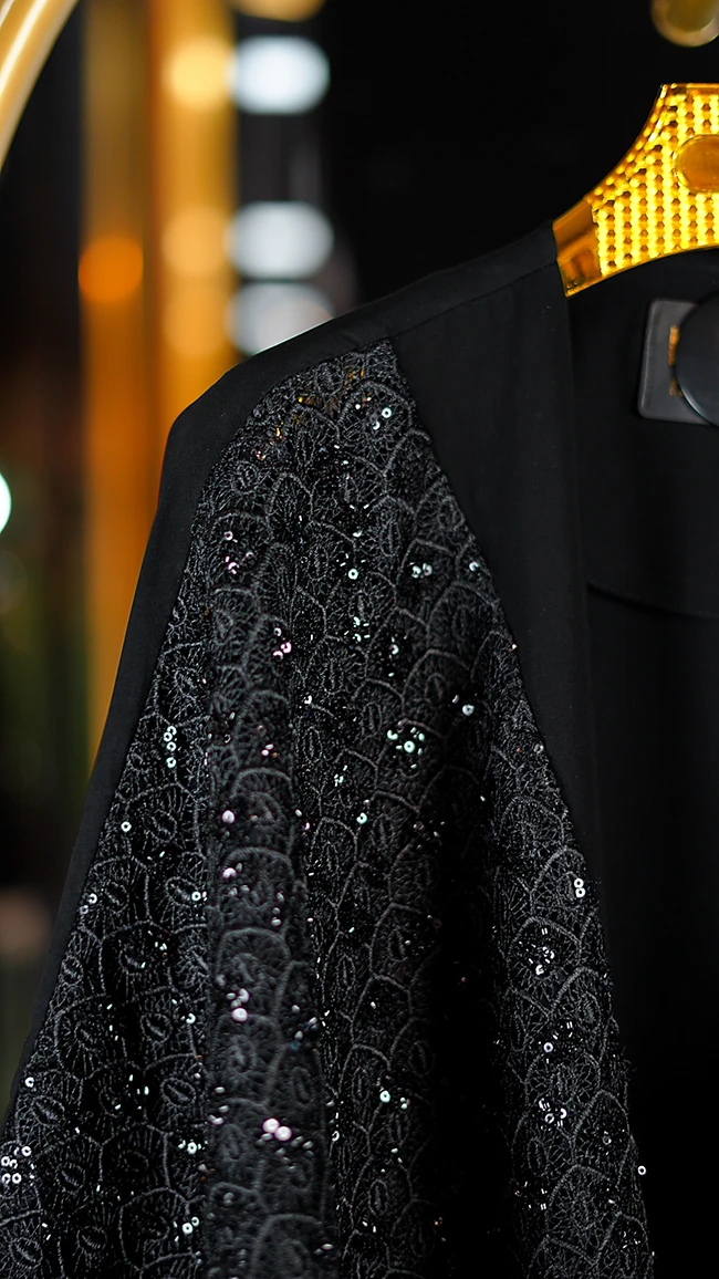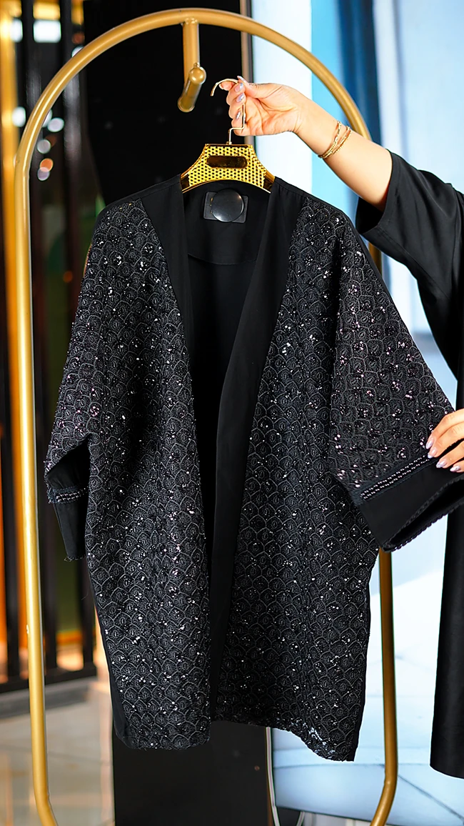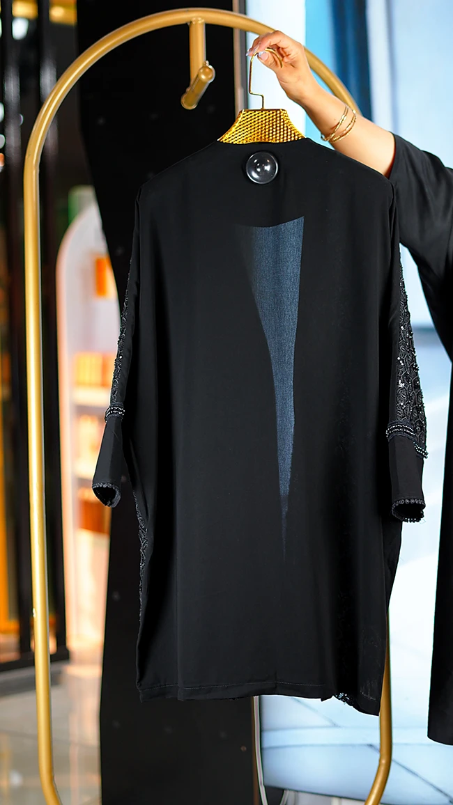 مانتو مجلسی کارشده مدل Berbina مشکی – طراحی خاص با سنگدوزی و ریشهدوزی