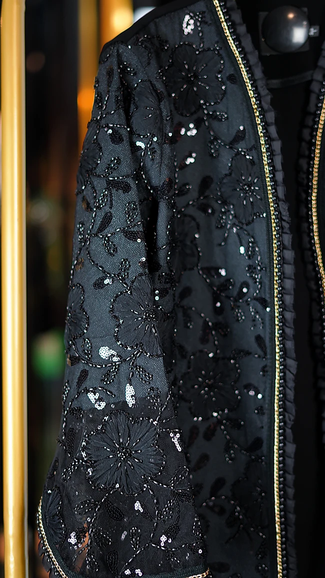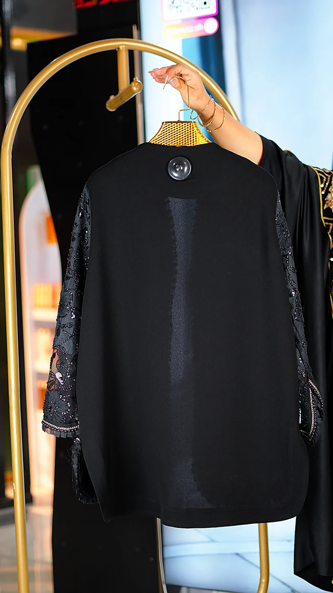 مانتو مجلسی کارشده مدل Berbina مشکی – طراحی خاص با سنگدوزی و ریشهدوزی