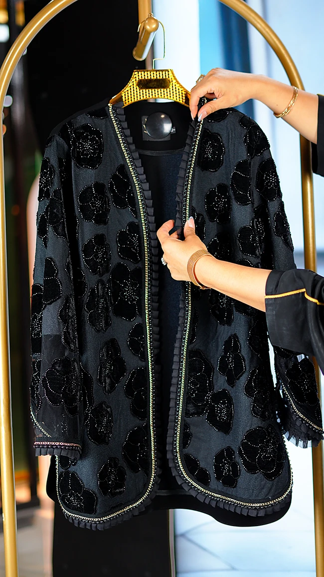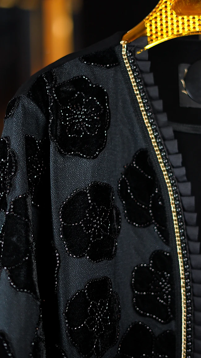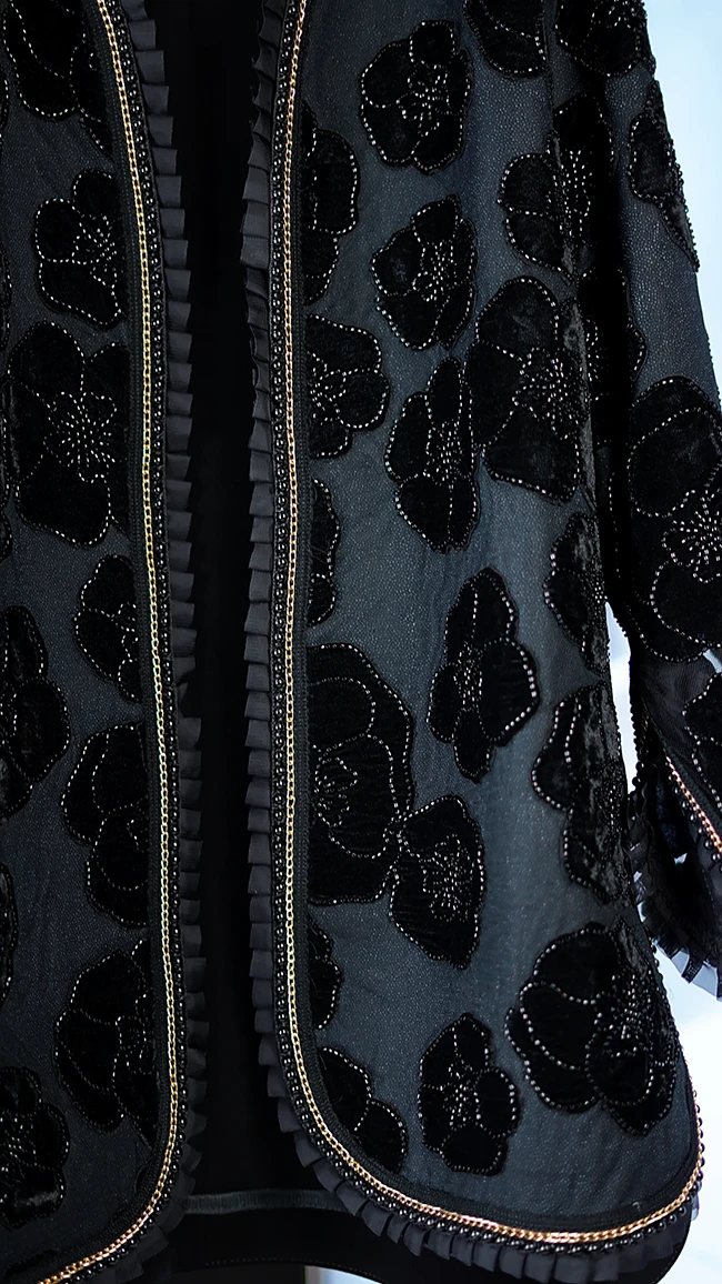 مانتو مجلسی کارشده مدل Berbina مشکی – طراحی خاص با سنگدوزی و ریشهدوزی