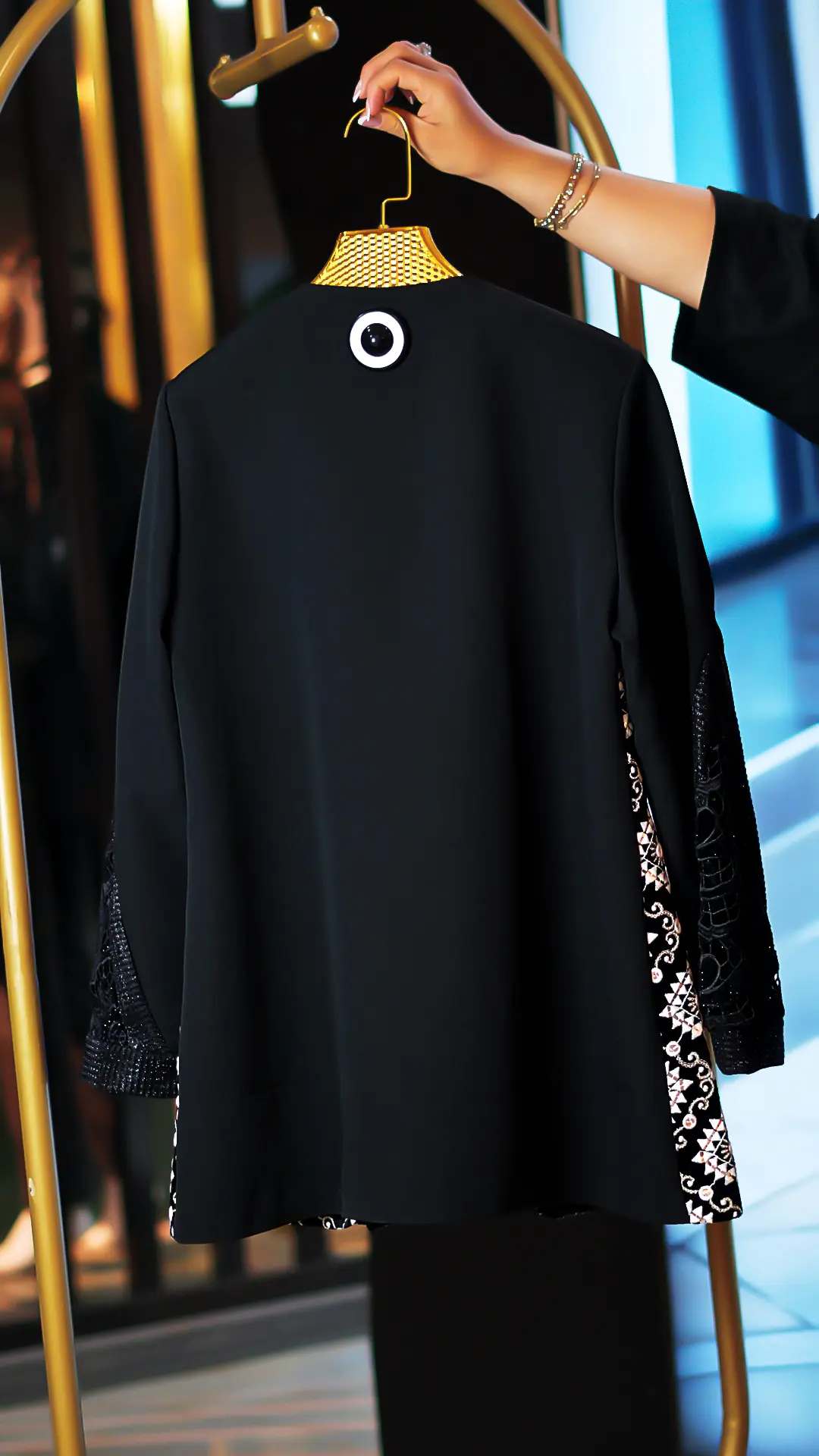 مانتو مجلسی کوتاه زنانه با آستین گیپور و سوزندوزی جلو | استایل خاص با پارچه ترک _ مشکی فری سایز
